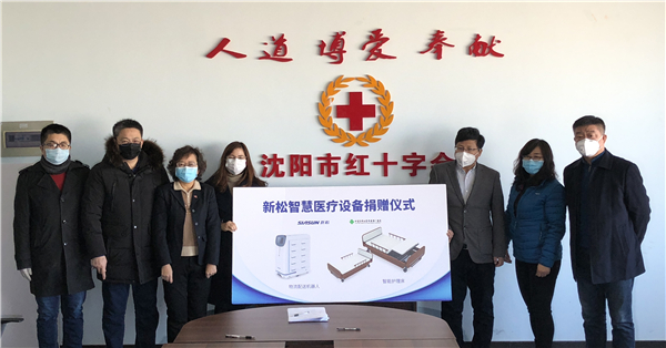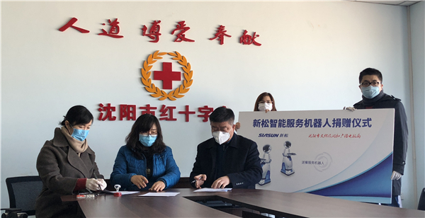 (圖)2月5日,捐贈儀式在沈陽市紅十字會舉辦,醫大一院副院長、工會主席滕偉禹,沈陽市文化旅游和廣播電視局副局長馬今,新松公司副總裁王玉山,沈陽市紅十字會副會長孟麗君共同簽字?